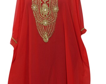 Bohemian Red Sequin Work Georgette Kaftan Dress V-Neckline Beach Bikini Cover Up Resort Wear Loose Tunic Caftan One Size