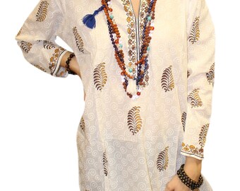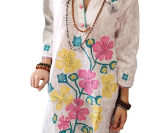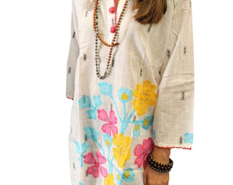 Bohemian Boho Chic Ethnic Indian Cotton Tunic White Floral Design Long Sleeves Kurti Dress S