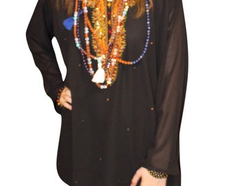 Women Black Caftan Dress Embellished Resort Wear Short Kaftan One Size