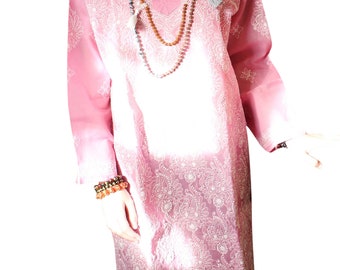 Bohemian Boho Chic Pink Long Tunic Beautiful Floral Embroidered Long Sleeves Ethnic Cotton Kurta Dress L