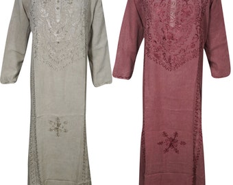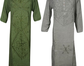 2 pc Boho Long Maxi Dresses LOUNGER Floral Embroidered Long Sleeves Rayon GYpsy Fashion Dresses XL