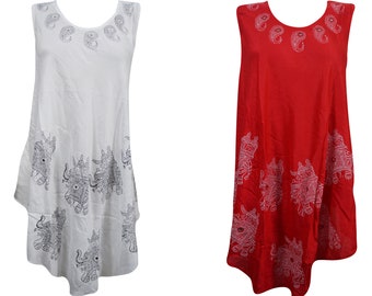 2 pc Women Bohemian Tank Dress Elephant Print Beach Boho Cover Up Caftan Dresses XL