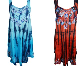 2Pc Bohemian Dresses Embroidered Tie-Dye Sleeveless Flare Boho Chic Coverup Sundress For Womens SML