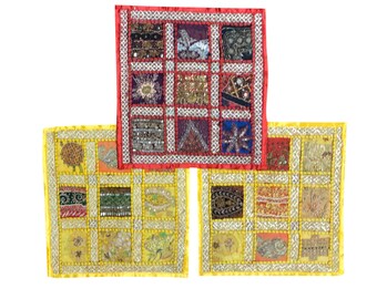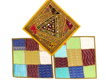 3 Pcs Toss Pillow Shams Vintage Patchwork Zari Embroidered Ethnic Cushion Covers 16" x 16"
